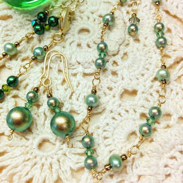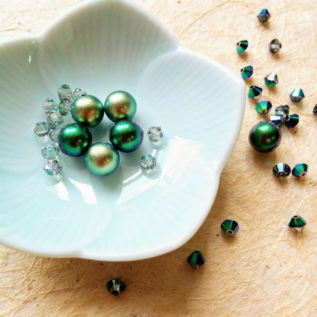 スワロフスキーのパールはミステリアスなグリーンカラーの“スカラベグリーン”(濃グリーン)と“イラデサントグリーン”(薄グリーン)。